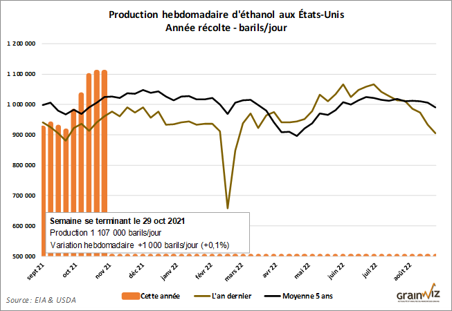 La production hebdomadaire d'éthanol demeure toujours à son plus haut depuis 2010, alors que les fabricants américains d'éthanol profitent d'excellentes marges.