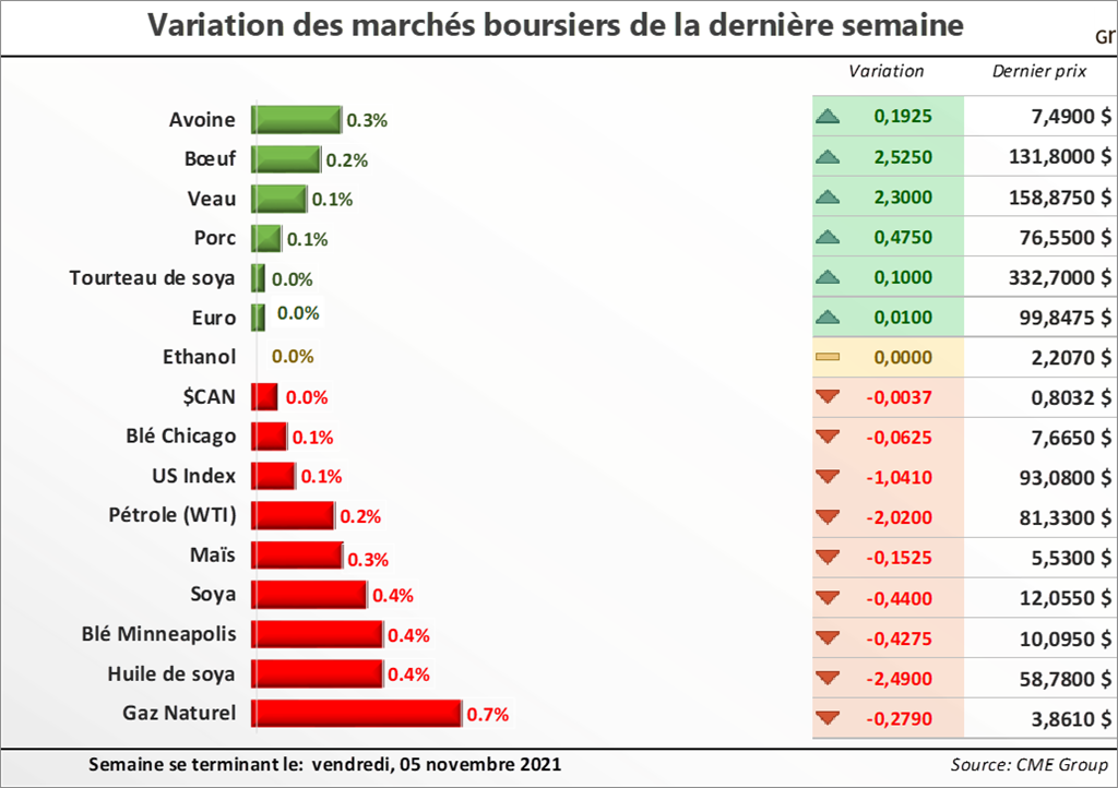 Ce mardi, nous aurons la publication d'un autre rapport mensuel du USDA, ce qui aura d'ailleurs certainement incité aussi les spéculateurs à prendre du recul et engranger des profits à Chicago la... Pour en savoir plus sur la situation actuelle et la tendance des marchés des grains et des viandes au Québec, lisez la suite dans la dernière édition du 08 novembre 2021 de la lettre financière.