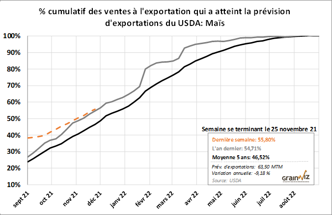 Par contre, il manque de vigueur depuis un moment du côté des exportations de maïs américains. Le volume actuel est comparable à l'an... Pour en savoir plus sur la situation actuelle et la tendance des marchés des grains et des viandes au Québec, lisez la suite dans la dernière édition du 06 décembre 2021 de la lettre financière.