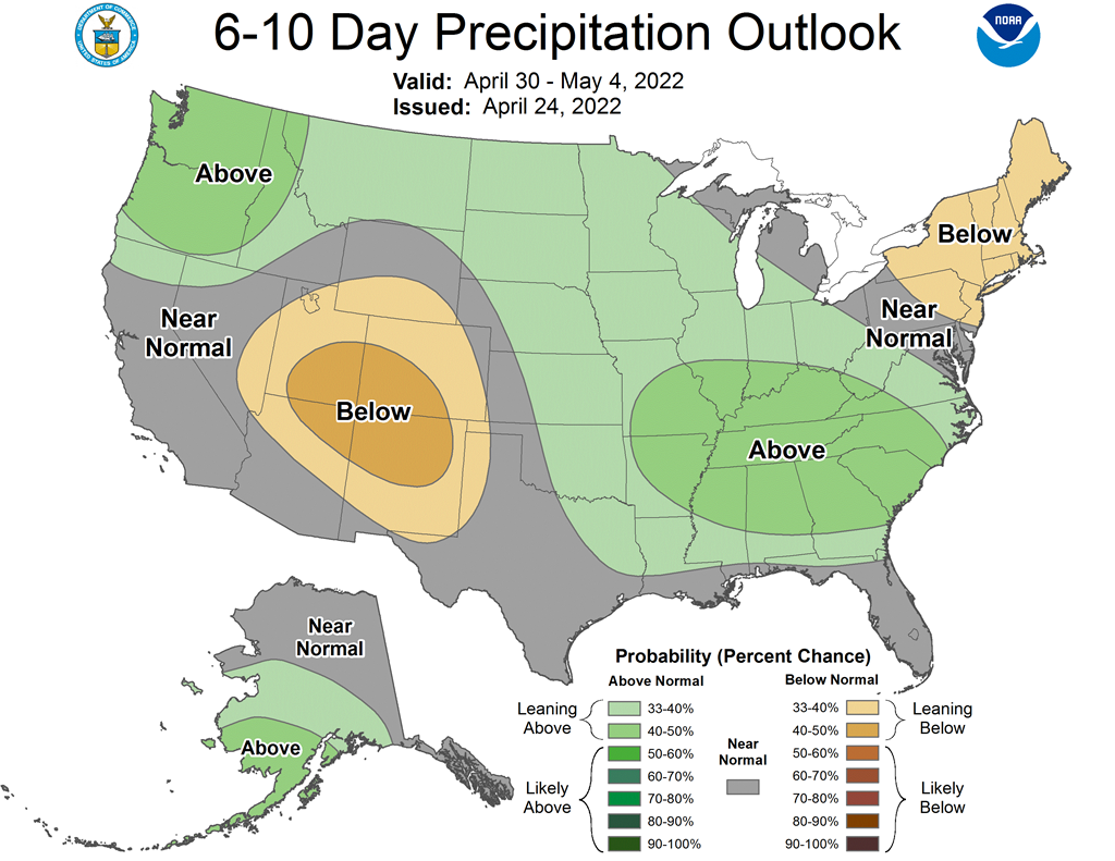 - Aux États-Unis, le début de saison est toujours au ralenti, avec encore des précipitations au-dessus des normales et des températures fraîches pour les deux prochaines semaines.