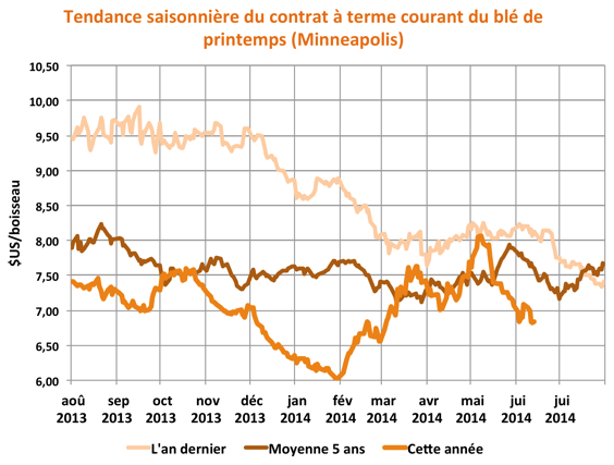 Marchés du blé - Après avoir perdu plus de 20% de sa valeur en quelques semaines, peu d'éléments donnent encore à penser qu'un creux définitif pour le marché du blé soit en vue. Même si les récoltes américaines se veulent moins prometteuses, le USDA aura eu tôt fait de rappeler dans son dernier rapport mensuel l'importance des récoltes mondiale prévue cette année.