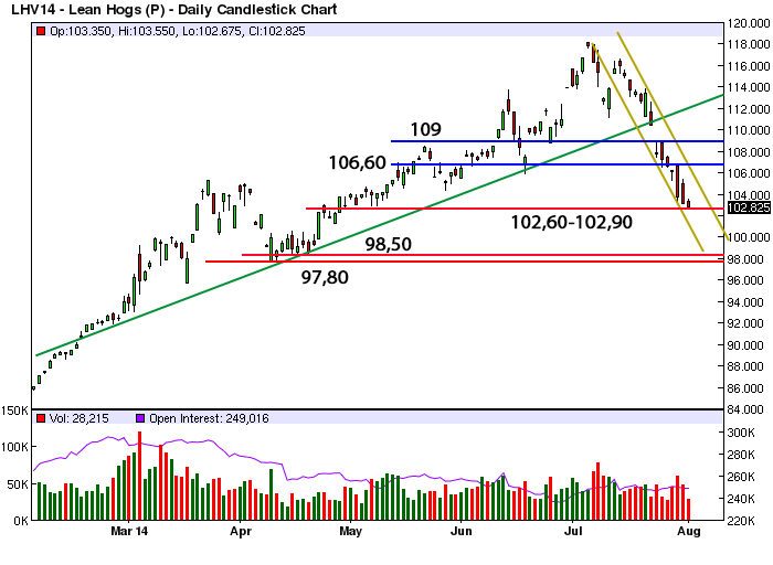 Le marché du porc est sous l'emprise d'une tendance à court terme baissière qui se confirme de semaine en semaine. L'approche de supports clés sont à surveiller, puisqu'ils pourraient mettre un terme à cette tendance négative, ou la dynamiser davantage.
