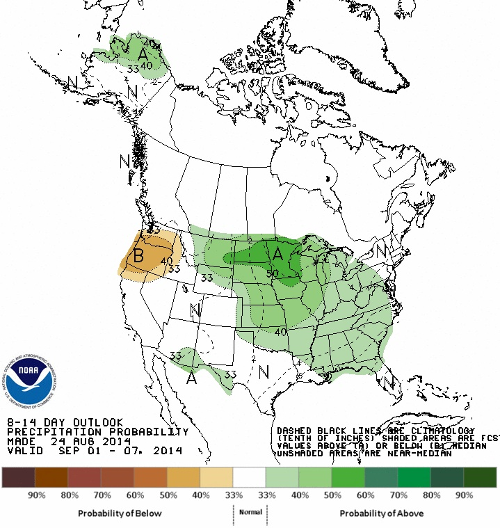 Météo - Des températures plus chaudes sont attendues dans le Midwest américain d'ici la fin du mois d'août avec des averses dispersées qui devraient couvrir l'ensemble du territoire. Pour les cultures en cours, les conditions prévues se veulent toujours très prometteuses, spécialement celles de soya qui en sont au stade du remplissage des gousses.