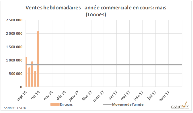 Le dernier rapport hebdomadaire d'exportation de grains américains a proposé des ventes de 2,06 millions de tonnes de maïs, plus que les anticipations des marchés et le plus haut niveau de ventes observé depuis avril dernier.