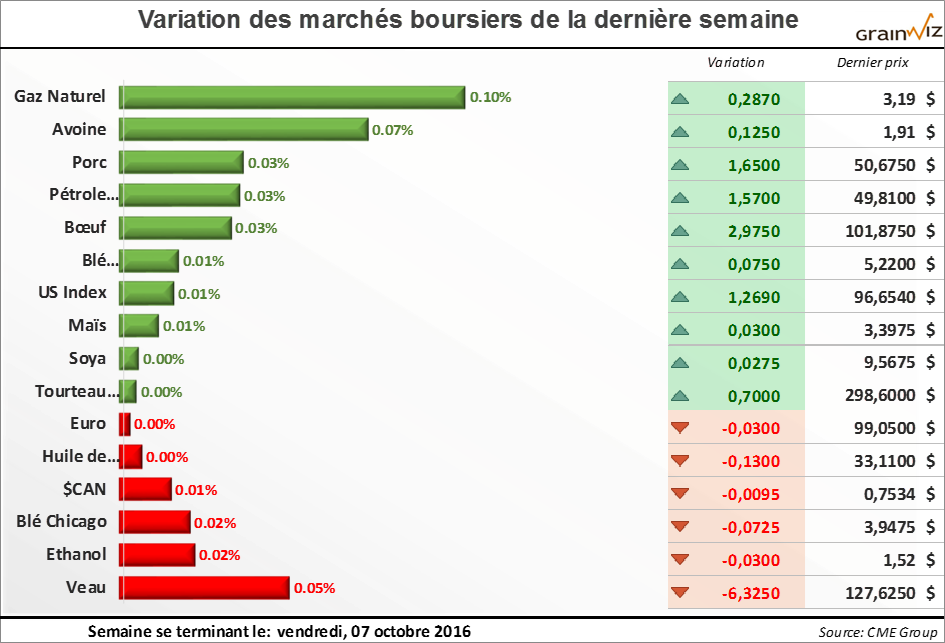 Maïs - Le marché du maïs tente d'amorcer timidement une tendance à court terme à la hausse. Ceci n'est pas sans lien avec la récolte américaine qui tarde un peu en raison des précipitations importantes observées dans plusieurs régions. On prévoit cependant des conditions météo beaucoup plus favorables pour les deux prochaines semaines, ce qui rend bien incertaine l'idée que le marché du maïs puisse poursuivre à la hausse à ce stade-ci de la saison.