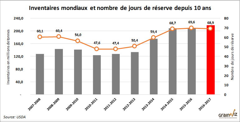 Avec des stocks mondiaux ajustés à la hausse à un niveau record de 218 millions de tonnes, le nombre de jours de réserve grimpe à 68,9 jours, moins que l'an dernier, mais toujours un nombre de jours historiquement élevé qui rend difficile d'envisager une appréciation des prix.