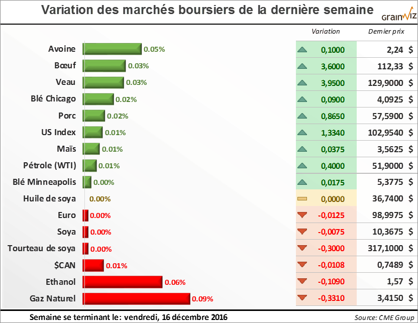 ** Prenez note que la lettre des marchés agricoles prendra relâche pour la semaine prochaine, 26 décembre 2016, de retour la semaine suivante le lundi 2 janvier 2017.**