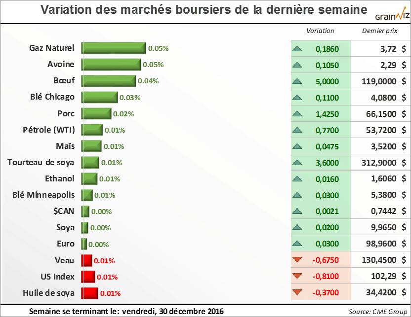 Maïs - Pour une 4e année consécutive, le marché du maïs à Chicago a terminé l'année en net recul, cette fois-ci de -0,07 à 3,51 $US/boisseau. Cette baisse survient alors que les récoltes américaines et mondiales ont fracassé de nouveaux records et que les consommateurs peuvent à nouveau compter sur une grande disponibilité de maïs pour assurer leur approvisionnement.