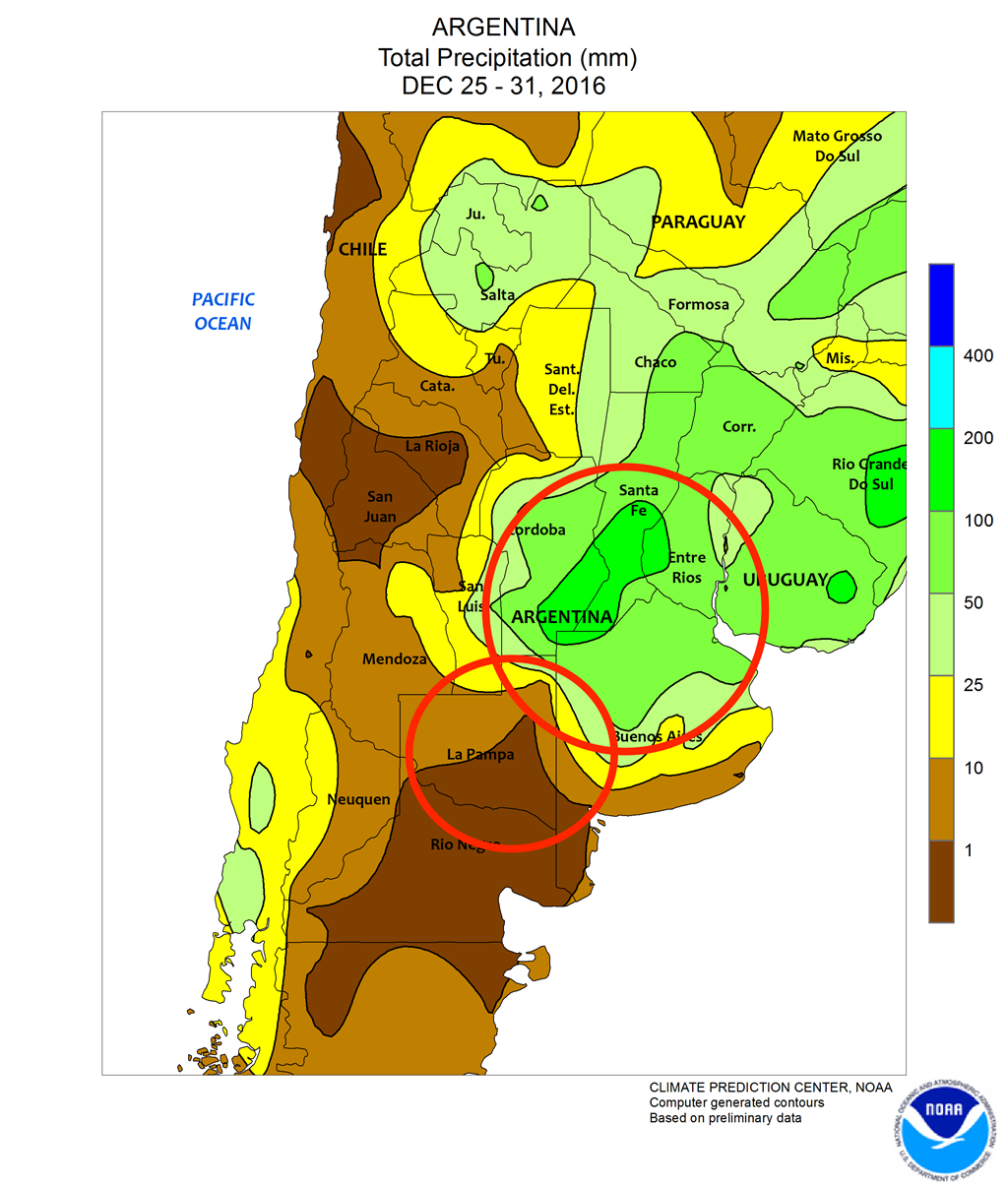 En Argentine, les conditions de début de saison restent loin d'être idéales. Les régions centres/sud sont trop sèches alors que celles plus au nord composent maintenant avec des précipitations excessives. L'Argentine est le 5e plus important producteur mondial de maïs et le 3e plus important exportateur mondial de la céréale.
