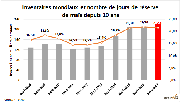 Le ratio inventaires/consommation de maïs dans le monde se resserre un peu après avoir atteint un sommet l'an dernier.