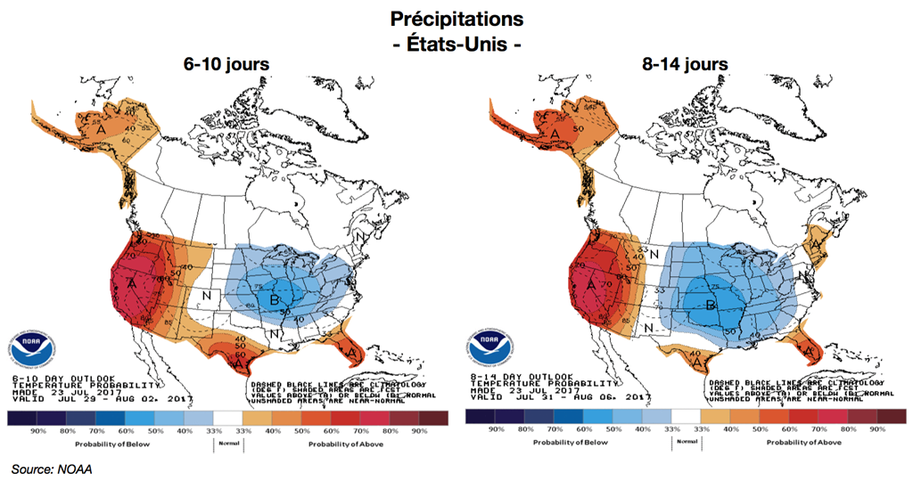 Les dernières prévisions météo proposent finalement des conditions plus fraiches qui devraient tranquillement prendre forme cette semaine. Ceci devrait calmer le jeu alors que les cultures aux États-Unis sont déjà à plus de 50% au stade de la pollinisation.