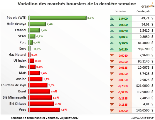 Maïs - La dernière semaine aura été plus difficile pour le marché du maïs. Aux États-Unis, la dernière vague de chaleur et temps sec de juillet est chose du passé et plusieurs des régions asséchées auront pu profiter de précipitations dans la dernière semaine. Tout n'est cependant pas nécessairement joué, puisque les dernières prévisions proposent du temps très frais, mais également sec pour plusieurs régions où le...