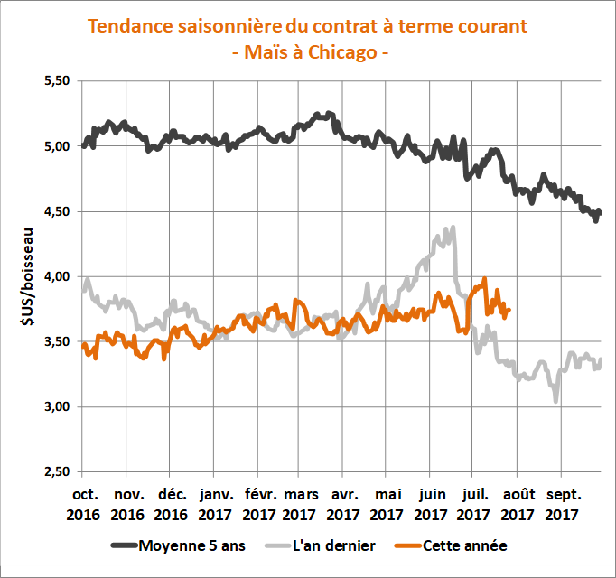 Avec le retour de conditions météo plus favorables pour les cultures aux États-Unis, le marché du maïs à Chicago est sous pression. Suivant la tendance saisonnière, un rebond demeure possible en août. Par contre, à moins d'imprévus météo d'importance, tout indique qu'il devrait maintenant reculer progressivement vers ses creux récoltes.
