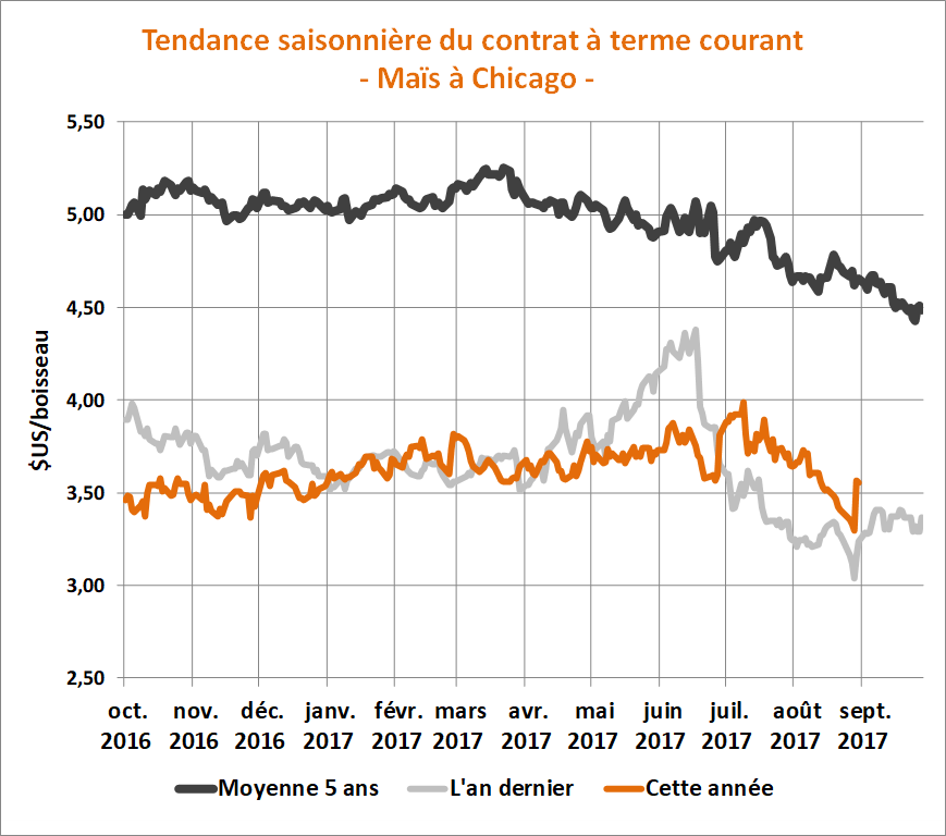 À l'image de l'an dernier, le marché du maïs a atteint un creux à la fin août. L'an dernier, ceci aura marqué un creux définitif à Chicago. Par contre, la tendance saisonnière suggère que le marché du maïs peut encore atteindre d'autres creux en septembre, puis en octobre.