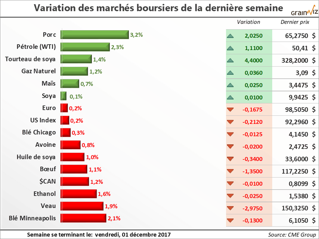 Maïs - Le marché du maïs à Chicago demeure lourd, mais aura eu le mérite de débuter le mois de décembre sur une note encourageante. Les chiffres d'exportation de maïs américain déçoivent toujours. Cependant, maintenant que la récolte est terminée, on rapporte que les bases commencent à s'apprécier du côté américain, signe que les producteurs ne vendront pas tant que la situation ne...