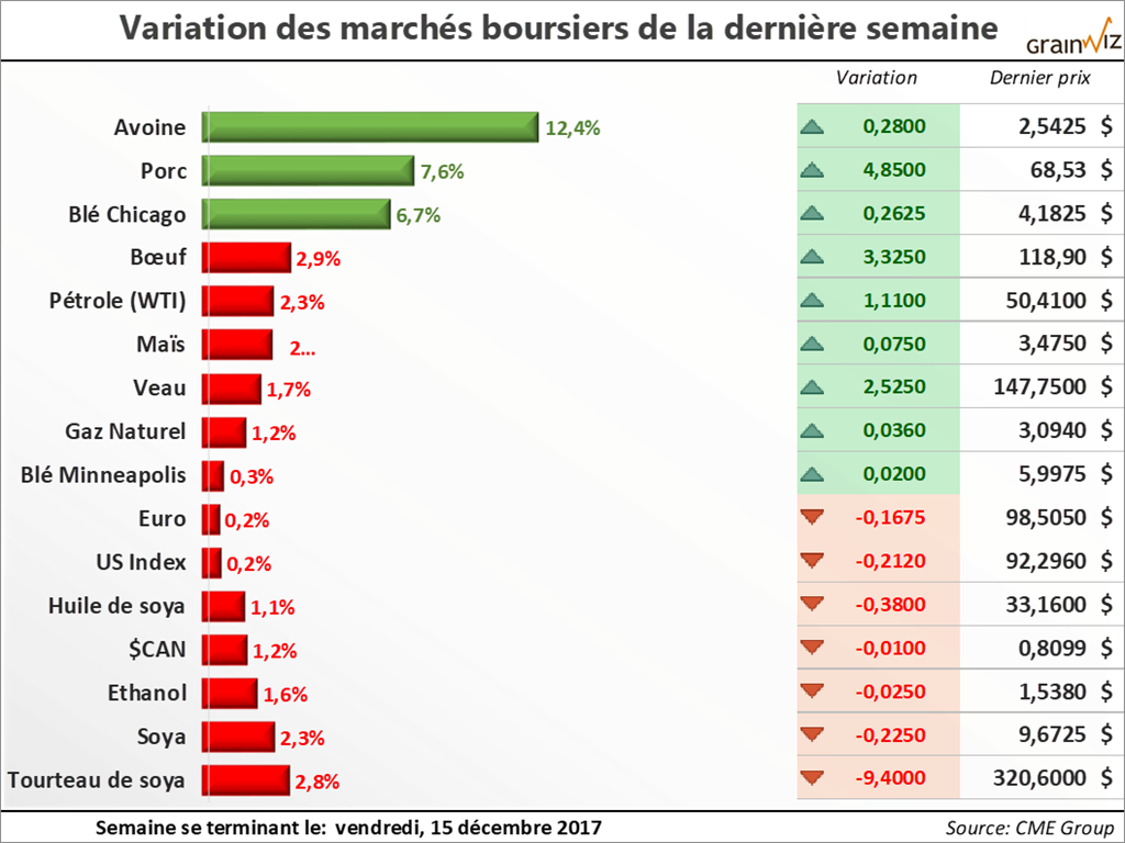 Le dernier rapport mensuel aura proposé peu de changement, et la météo se veut plus prometteuse pour le début de saison en Argentine et au Brésil.... Pour en savoir plus sur la situation actuelle et la tendance des marchés des grains et des viandes au Québec, lisez la suite dans la dernière édition du 18 décembre 2017 de la lettre financière.