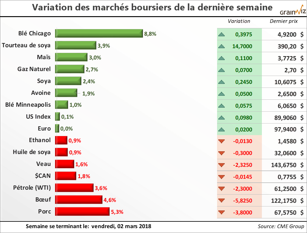 Pour les prochains jours, beaucoup dépendra des prochaines prévisions météo. Dans l'immédiat, au moment d'écrire ces lignes, des précipitations semblent prendre forme à l'horizon pour la fin de la semaine, puis... Pour en savoir plus sur la situation actuelle et la tendance des marchés des grains et des viandes au Québec, lisez la suite dans la dernière édition du 05 mars 2018 de la lettre financière.
