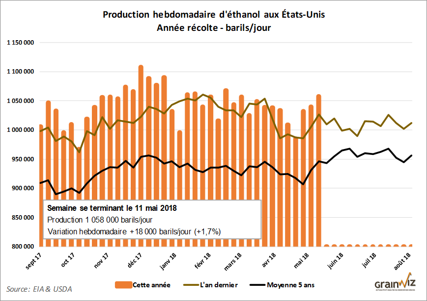 La production hebdomadaire d'éthanol aux États-Unis est de retour en force depuis 3 semaines, en hausse la semaine du 11 mai de +3% par rapport à la même période l'an dernier à 1,058 millions de barils/jour.