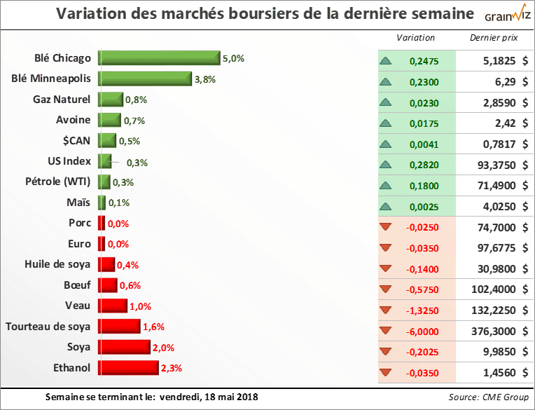 Dans ce même ordre d'idée, avec de bonnes conditions de début de saison aux États-Unis,... Pour en savoir plus sur la situation actuelle et la tendance des marchés des grains et des viandes au Québec, lisez la suite dans la dernière édition du 21 mai 2018 de la lettre financière.