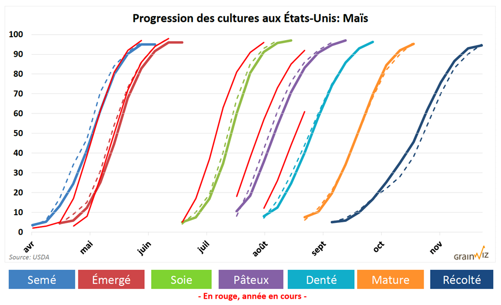 Avec le développement toujours très rapide des cultures aux États-Unis, certains s'interrogent toujours à l'effet que le rendement américain en maïs pourrait ne pas être aussi important que ne le suggèrent les prévisions actuelles.