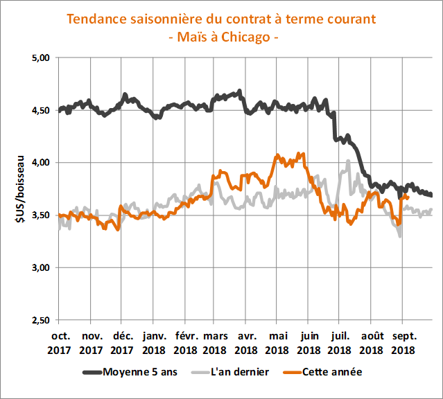 Suivant la tendance saisonnière, le marché du maïs à Chicago a pour habitude d'atteindre un creux à la fin août. Dans cette même veine, à défaut de surprises avec la publication du prochain rapport mensuel du USDA, il n'a pas par contre pour habitude d'afficher beaucoup de progression en septembre.