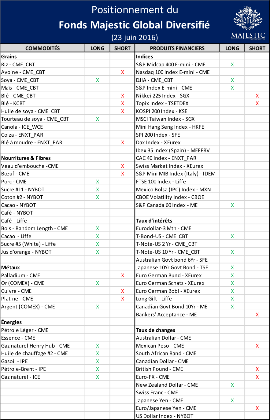 Majestic vous permet d’accéder gratuitement aux positions du portefeuille d’un gestionnaire professionnel. Nous vous offrons une transparence complète en publiant les positions du Fonds Majestic Global Diversifié de façon hebdomadaire sur Grainwiz et par infolettre (cliquez ici pour vous inscrire). Bien sûr, le moment exact des transactions et le poids de chaque position n’est pas divulgué, mais ce rapport hebdomadaire vise à vous partager les tendances qu’identifient le modèle quantitatif d’un gestionnaire professionnel.