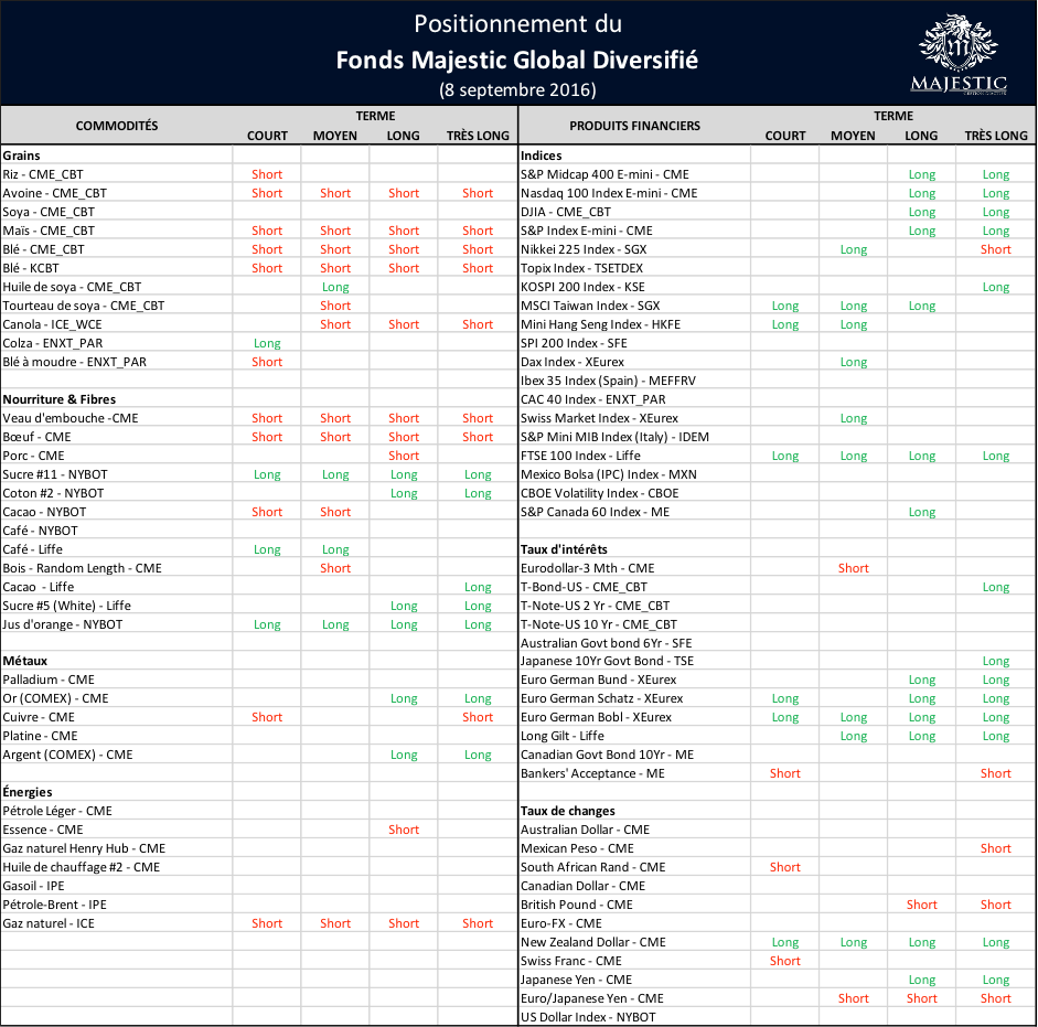 Majestic vous permet d’accéder gratuitement aux positions du portefeuille d’un gestionnaire professionnel. Nous vous offrons une transparence complète en publiant les positions du Fonds Majestic Global Diversifié de façon hebdomadaire sur Grainwiz et par infolettre (cliquez ici pour vous inscrire).  Bien sûr, le moment exact des transactions et le poids de chaque position n’est pas divulgué, mais ce rapport hebdomadaire vise à vous partager les tendances qu’identifient le modèle quantitatif d’un gestionnaire professionnel.