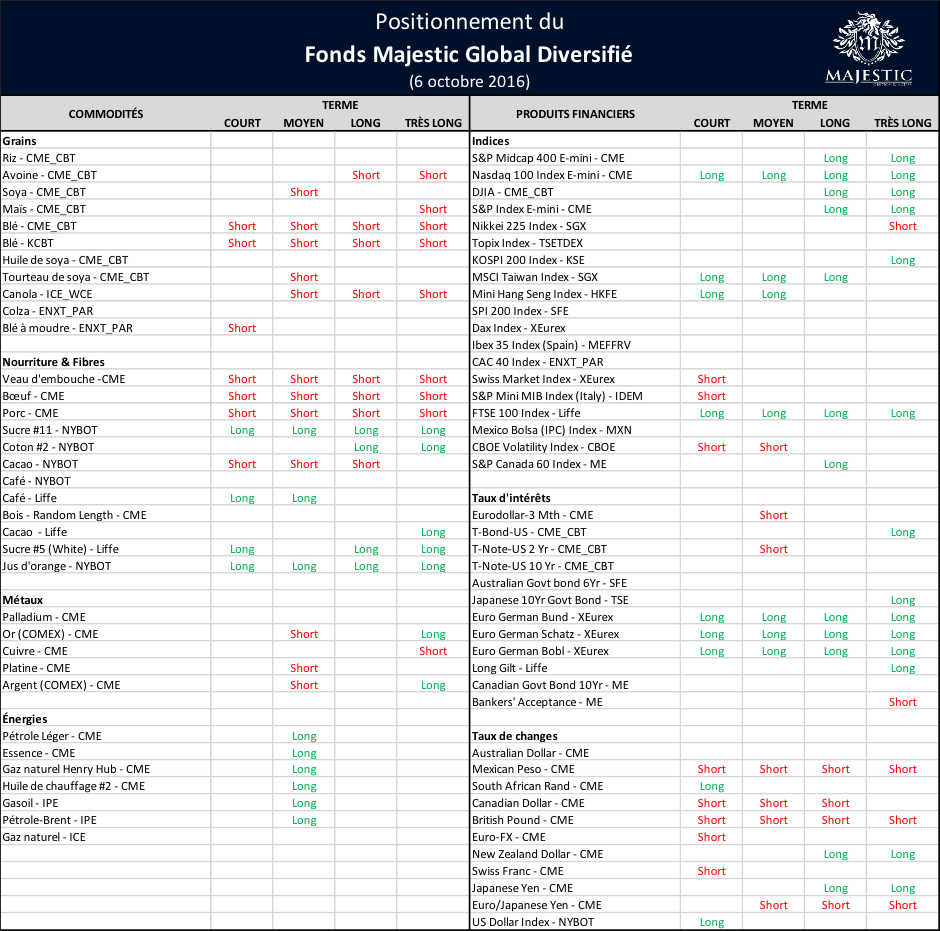 Majestic vous permet d’accéder gratuitement aux positions du portefeuille d’un gestionnaire professionnel. Nous vous offrons une transparence complète en publiant les positions du Fonds Majestic Global Diversifié de façon hebdomadaire sur Grainwiz et par infolettre (cliquez ici pour vous inscrire).  Bien sûr, le moment exact des transactions et le poids de chaque position n’est pas divulgué, mais ce rapport hebdomadaire vise à vous partager les tendances qu’identifient le modèle quantitatif d’un gestionnaire professionnel.