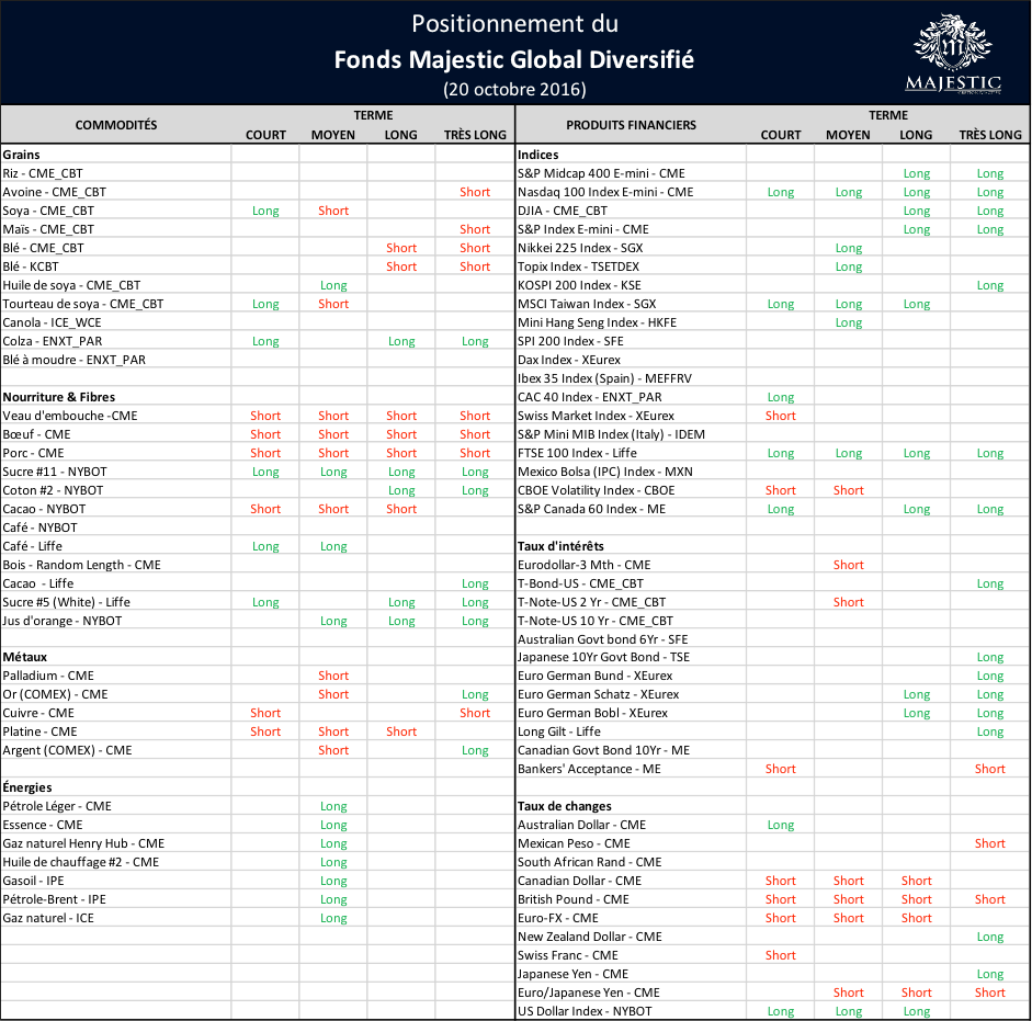 Majestic vous permet d’accéder gratuitement aux positions du portefeuille d’un gestionnaire professionnel. Nous vous offrons une transparence complète en publiant les positions du Fonds Majestic Global Diversifié de façon hebdomadaire sur Grainwiz et par infolettre (cliquez ici pour vous inscrire).  Bien sûr, le moment exact des transactions et le poids de chaque position n’est pas divulgué, mais ce rapport hebdomadaire vise à vous partager les tendances qu’identifient le modèle quantitatif d’un gestionnaire professionnel.