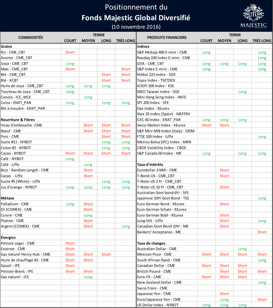 Majestic vous permet d’accéder gratuitement aux positions du portefeuille d’un gestionnaire professionnel. Nous vous offrons une transparence complète en publiant les positions du Fonds Majestic Global Diversifié de façon hebdomadaire sur Grainwiz et par infolettre (cliquez ici pour vous inscrire). Bien sûr, le moment exact des transactions et le poids de chaque position n’est pas divulgué, mais ce rapport hebdomadaire vise à vous partager les tendances qu’identifient le modèle quantitatif d’un gestionnaire professionnel.