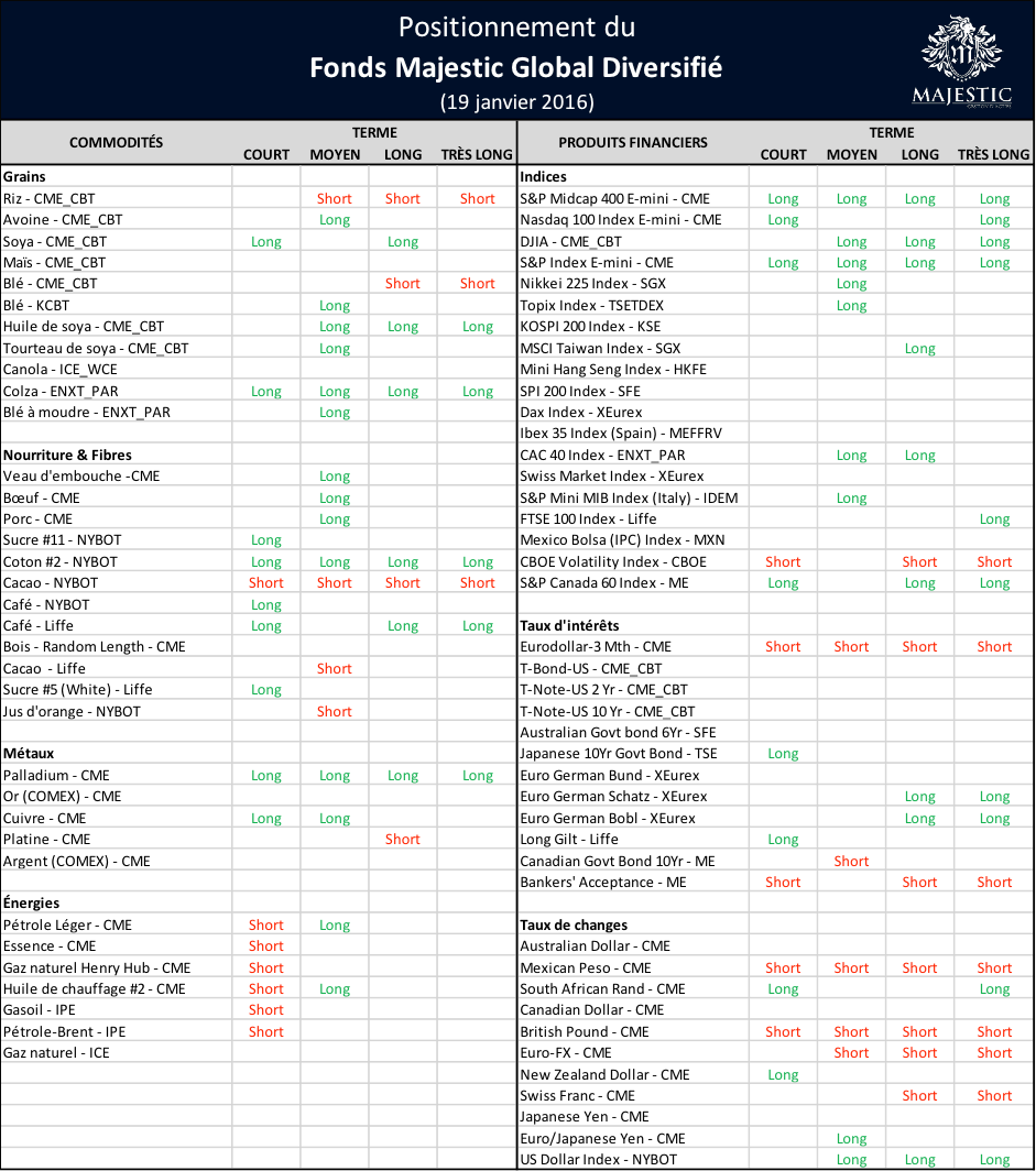 Majestic vous permet d’accéder gratuitement aux positions du portefeuille d’un gestionnaire professionnel. Nous vous offrons une transparence complète en publiant les positions du Fonds Majestic Global Diversifié de façon hebdomadaire sur Grainwiz et par infolettre (cliquez ici pour vous inscrire).  Bien sûr, le moment exact des transactions et le poids de chaque position n’est pas divulgué, mais ce rapport hebdomadaire vise à vous partager les tendances qu’identifient le modèle quantitatif d’un gestionnaire professionnel.