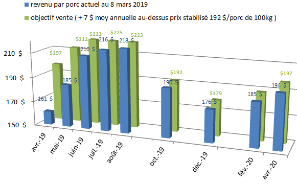 Les objectifs de prix de vente sont basés sur des objectifs de 7$ de gain annuel par rapport au prix stabilisé, qui serait présentement de 192$ par porc de 100 kg, un peu en baisse car les contrats de maïs baissent depuis quelques jours.... Ceci dit, une coupure d'ASRA est annoncée pour 2019, mais tant que ce n'est pas final et officiel , il est préférable de conserver le modèle actuel pour le hedging.