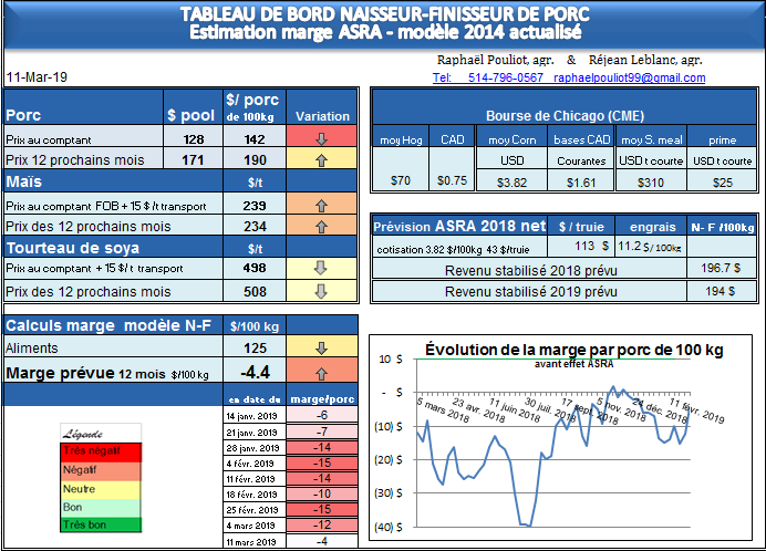 lundi 11 mars, la marge est encore dans le rouge, mais s’est grandement amélioré en une semaine... -4.4 $ par porc de 100 kg, la marge est négative en fait à cause des prix sur le court terme : 127$ de pool comme prix du jour, 51 $ US, mais avril est beaucoup plus haut à 60 $, après un beau limit up vendredi ... pour s’encourager les prix éloignés sont intéressants, par exemple avril 2020 est à 71$ au lieu du 60$ d’avril 2019, soit près de 23$ par porc plus élevé. Selon la bourse la fin des mauvais prix est pour juin cet été, on est de retour à 220 $ par porc de 100 kg pour juillet et août. Aussi le dollar canadien est dans les 0.74 . Globalement les 12 prochains mois donneraient des revenus de vente de 190$ le porc de 100 kg.