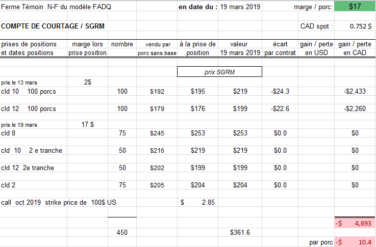 La Ferme Témoin de 360 truies et 5672 porcs prend de nouvelles positions, elle n’avait vendu jusqu’ici que seulement 200 porcs, ce qui lui donnera des positions sur août, octobre, décembre et février ; cependant, étant donné le potentiel de fortes hausses de prix lié à la baisse de cheptel en Chine, la ferme va acheter un call sur un lean hog, pour se protéger contre une très forte hausse des contrats. Le call acheté est sur le hog d’octobre 2019 à un prix de levée de 100 $ US, alors que le CAT d’octobre vaut présentement 80$ US; le coût de l’assurance est de 2.85 $ US, soit 7.7 $ par porc en canadien ; cette stratégie protège contre une hausse du contrat d’octobre s’il venait à monter au-dessus de 100 $, au cas où les prix atteindraient des proportions stratosphériques…. Si le prix reste en bas de 100$ US à l’ échéance, le montant investi à acheter cette assurance sera perdu; ce qui ne signifie pas que ce montant aura été perdu inutilement, cette option sert à prendre des cld , dans un contexte explosif de prix à la hausse !