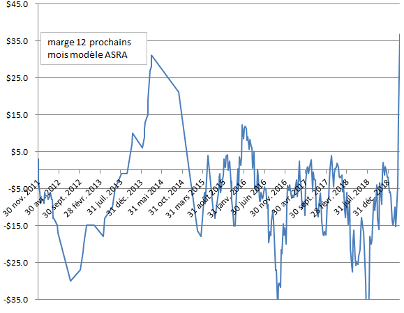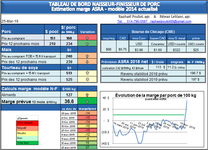 La marge à la fermeture des marchés vendredi est de 37$ par porc de 100 kg pour les 12 prochains mois. En fait durant la journée de vendredi, la marge a monté + 45$ le matin , lorsque certains contrats étaient presque à nouveau limit up; en plus le CAD baisse en bas de 0.75 . Les contrats de porc d’été 2019 sont allés chercher au-dessus du prix psychologique de 100 $ avant de re-descendre … Il reste que sur une semaine la progression est impressionnante, on est allé chercher 40$ par porc en quelques jours. La marge prévisionnelle est présentement le maximum atteint en 2014 lors de la DEP ( le prix de pool au comptant , le réel, fut de 211$ du 100 kg, à peine plus haut que le prix des 12 prochains mois ). Par contre, en 2014 le taux de change était au-dessus de 0.90, cela fait toute la différence, on est à des prix très intéressants en canadien, alors que les Hog n’ont pas encore rejoint en US des valeurs au-dessus de 105 US et plus qui avaient déjà été atteint sur les mois d’été, dans des années avant 2014.