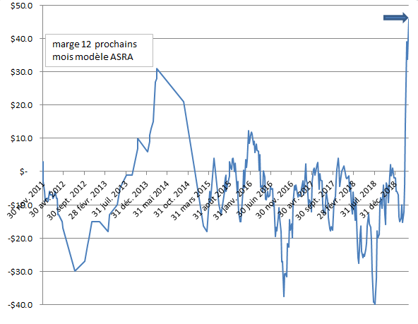 Les porcs de juillet et août rapporteraient 275$ du 100 kg, le comptant est déjà rendu à 213$ par porc de 100 kg, mais monte moins vite depuis quelques jours; déjà le 15 mai les porcs rapporteraient 249 $. Les contrats d’été 2019 sont de retour à leur sommet atteint à la fin mars, la marge est pas mal plus haute, car les autres contrats ont aussi décollé ( mai 2019 , octobre... ) . Le marché ‘’sur-prime’’ les contrats d’été 2019 versus leurs historique respective aux autres échéances , à partir maintenant du mois de mai 2019, versus des positions plus lointaines, comme avril 2020... est-ce que les chinois vont importer du porc si rapidement pour mai 2019, et auront beaucoup ralenti pour avril 2020 ?