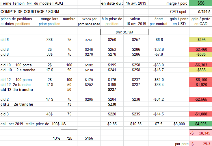 La ferme Témoin de 5672 porcs par an place 125 porcs au SGRM ( 50 cld 12, 75 cld 2 ), sur des positions où le marché est maintenant 25$ par porc plus élevé que ses dernières tranches placées. La ferme détient maintenant 725 porcs, soit 13 % de son volume annuel. Elle va aussi booker ses primes de tourteau de soya de octobre 2019 à mars 2020, à 10$ US tonne courte ( on entend des offres moins chères que ce prix ).