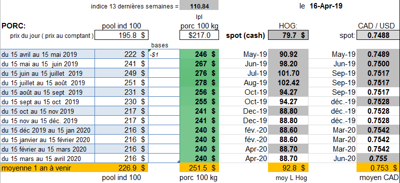 Mardi 16 avril, la marge continue à monter, présentement 56$ par porc de 100 kg au-dessus du prix stabilisé de 196 $ le 100 kg , soit des revenus de vente pour les 12 prochains mois de 251$ par porc ( l'ASRA final 2018 vient de sortir à 196.9 $ du 100 kg de prix stabilisé ajusté , pour 2019 on assume que la coupure prévu au modèle est .... en suspens... en d'autres termes la marge est peut-être 60$ au-dessus du prix stabilisé ! ). Ce sont surtout les échéances éloignées qui montent .