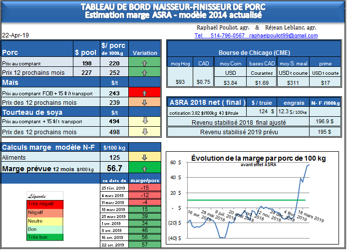 Cette semaine on a vu l’été 2019 faire du surplace autour de 100 US, mais les échéances plus éloignées ont progressé; c’est que le prix au comptant a ralenti sa montée à 80$ US (219$ par porc tout de même ! ) , le lean hog de mai se stabilise à 90$ ( 245$ par porc ), ce qui laisse moins d’enthousiasme pour du porc à 280$ en juillet. Par contre décembre 2019 est maintenant à 243 $ par porc, comme février et avril 2020, sans spread. Le contrat d’été 2020 le plus cher est juin à 95$, toute l’année 2020 a fortement augmentée la semaine passée. En résumé le marché ‘’cherche’’ quand les commandes massives chinoises arriveront, et de plus en plus les acheteurs de contrats pensent que ces achats chinois arriveront plus tard qu’initialement. La bonne nouvelle est que la marge sur 1 an augmente encore à 57$ par porc au-dessus du prix stabilisé, mais en plus ces excellents prix sont présents sur les 18 prochains mois.