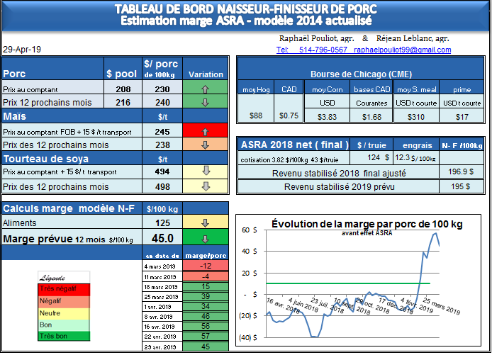 Lundi 29 avril, les hogs ont connu de fortes baisses la semaine passée, tous les jours de la semaine, heureusement un peu compensées par la baisse du taux de change à près de 0.74 . Les hogs d’été 2019 sont maintenant assez loin de 100$ US, 94$ US présentement pour le plus élevé ( août ). Mine de rien on a perdu 20 $ par porc sur les échéances d’été 2019 versus leur sommet, et encore plus sur juin 2019; c’est que le marché semble penser que les importations chinoises arriveront plus tard dans l’année, les positions du printemps 2020 ont perdu 10$ par porc; pendant ce temps l’été 2020 est rendu presque au même niveau que l’été 2019.... Sur 1 an ce sont des revenus de 216$ de pool, 240$ par porc de 100 kg, soit une marge de 45$ par porc au-dessus du prix stabilisé. Même s’il s’agit d’une baisse importante, pour garder la perspective, la marge reste équivalente à ce qui a été atteint comme prix reçu en 2014 lors de la DEP .