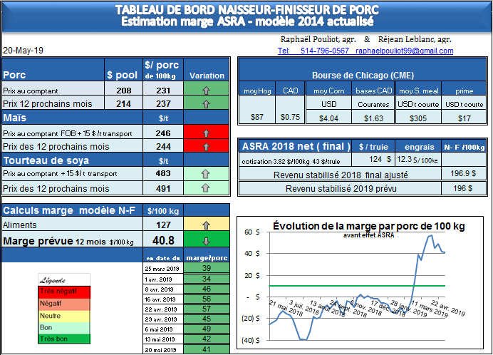 Malgré une hausse du prix des grains à cause du retard dans les semences, la marge par porc demeure très bonne. Cela s’explique plus par le maintien de bons prix pour l’automne et l’hiver 2019-20. On note beaucoup de volatilité dans le marché, sans savoir de quel côté les marchés iront. Avec de telles marges, vous devriez quand même avoir sécurisé une part de votre volume. Ce n’est pas souvent que l’on peut dégager une telle marge dans le secteur porcin. Il faut être prudent à viser les hauts de marché.