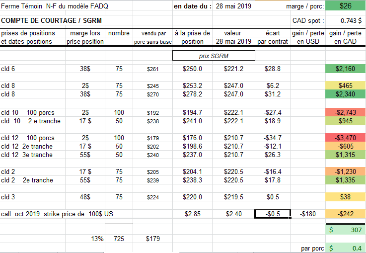 La ferme Témoin ASRA naisseur-finisseur va renverser des cld rapprochés, son cld 6 à 29$ de gain par porc et un peu de cld 7, ses 75 porcs faisant 31 $ de gain par porc. Le cld 6 ( juin ) doit être renversé par la décision du producteur d'ici le 2 juin , donc d'ici ce vendredi 31 mai; sinon c'est le SGRM qui le renversera dans la semaine entre le 3 et le 7 juin, la journée de la semaine à laquelle la ferme expédie ses porcs habituellement.