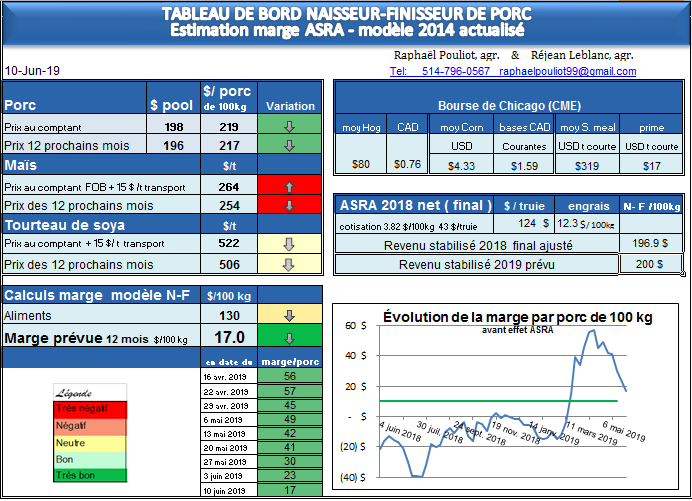 Lundi 10 juin, les prix du porc continuent à dégonfler: après les limit down de vendredi, le prix de pool pour les 12 prochains mois serait de 196 $, soit des revenus de 217 $ par porc de 100 kg. Avec la forte hausse du prix du maïs, cela porte le coût de production à 200$ par porc ( sans tenir compte de la coupure prévue par le nouveau modèle, étant donné que les ÉPQ contestent cette coupure. ) . La marge future est donc de 17$ sur 1 an. Pour l’année calendrier du 1er janvier au 31 décembre 2019, les prix reçus jusqu’ici sont de 164$ de pool en moyenne, pour les 6 prochains mois à venir 213 $, ce qui donnerait 191 $ de pool de moyenne, 212 $ par porc de 100 kg; en d’autres termes pour 2019, on est toujours loin d’un déclenchement de l’ASRA, avec ou sans coupure...