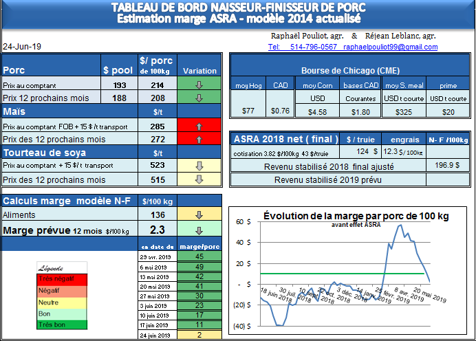 La marge 1 an continue de fondre, 2.3 $ par porc de 100 kg présentement pour entre le 24 juin 2019 et le 24 juin 2020, soit pool de 187$, 207$ de ventes par porc de 100 kg.