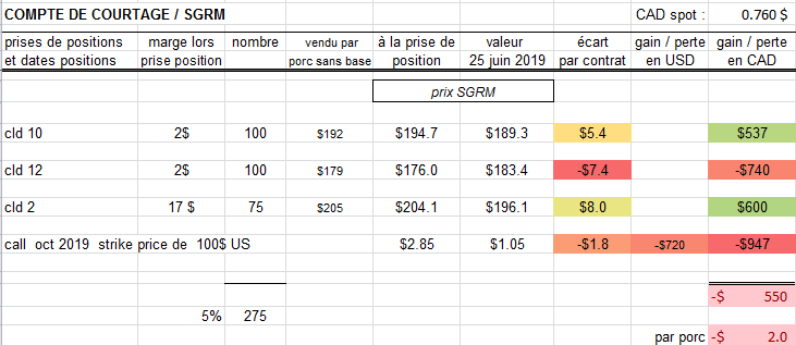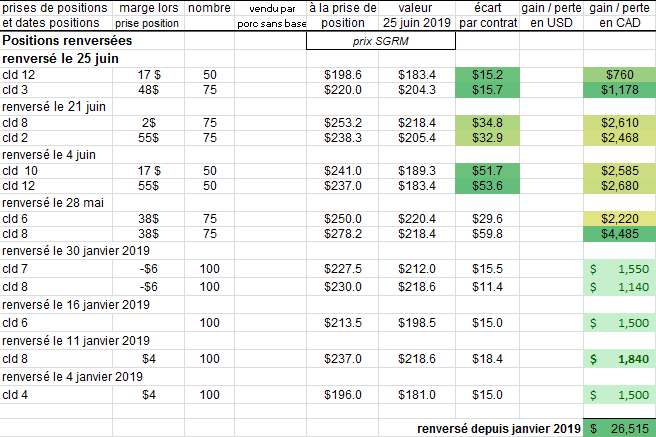 Mardi 25 juin, la ferme Témoin de 5672 porcs par an renverse d'autres cld ( no 12 et no 3, faisant 15$ de gain par porc ). Hier le 24 juin la bourse était ouverte même si le SGRM était fermé, on a vu des baisses de 3.7 sous sur les positions rapprochées. Aujourd'hui le 25 juin les hogs remontent d'un peu plus de 1 sous, mais globalement la marge N-F 1 an est maintenant négative. Avec les bas prix du début de l'année calendrier 2019 ( janvier à mars ), l'année 2019 est maintenant autour du prix stabilisé ( dépendament si vous utilisez l'ancien modèle ou le nouveau CECPA ! ) , en d'autres termes si les prix tombent plus bas, la FADQ compenserait, c'est pourquoi il est acceptable maintenant de renverser nos dernières positions avec moins d'objectifs de gains par porc ( on ne vise plus des 30$ et plus de gain par porc ).