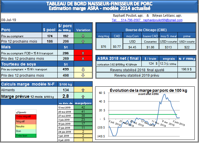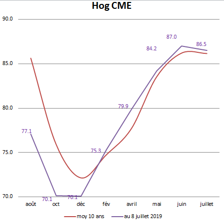 À la fermeture des marchés vendredi, les prix futurs pour les 12 prochains mois sont de 184$ le 100 kg à l’indice 100, auquel nous ajoutons désormais la nouvelle prime de 2$ de la convention ( ce qui donne 186$ de pool, 206$ par porc de 100 kg ). Avec des prix de maïs à 269 $ livré sur 12 mois, le prix stabilisé de la période serait de 203$ par porc, et donc une marge + 2.8 $ . Les Hogs ont essayé de reprendre le terrain perdu la semaine passée, mais ce fut de courte durée, les prix ont rechuté jeudi et vendredi. Sur le court terme les prix sont bas, la découpe ne vaut que 71$ US, le prix du porc au comptant aux États-Unis est de 73$, le lean hog de juillet est un peu plus bas, 72$. Ces prix sont plus bas que la moyenne 10 ans comme vous pouvez le voir sur ce tableau, par contre à partir de février 2020 le marché remonte à sa normalité , tiré par les perspectives d’exportation due à la PPA en Chine.
