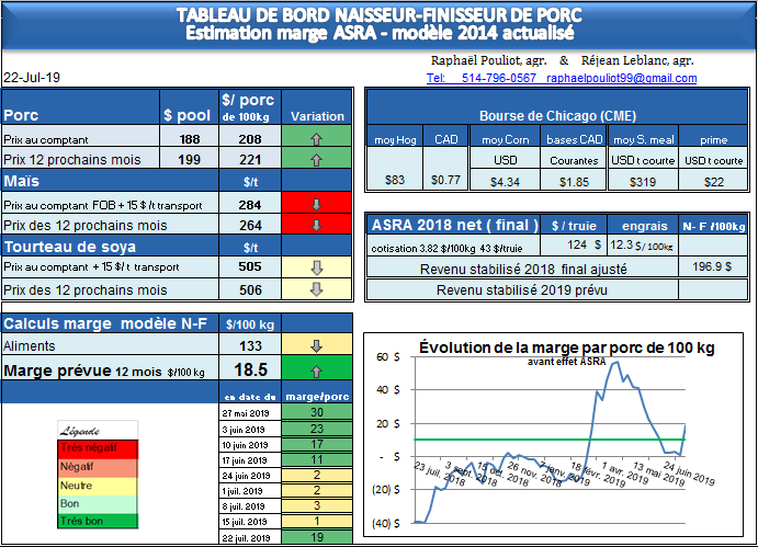Après quelques semaines à des niveaux bas pour cette période de l’année, la marge par porc est revenue à des niveaux intéressants. À près de 19 $/porc, il peut-être opportun pour certain de sécuriser un pourcentage. Les nouvelles en Chine indiquent toujours des problèmes de maladie, mais pour l’instant le gros des achats par la Chine a eu lieu dans d’autres pays que les États-Unis. Il faut garder en tête que la hausse de production aux États-Unis est importante et que la hausse des volumes exportés sera important pour supporter la hausse de prix. Il faut donc avoir cela en tête dans vos stratégies de gestion de risques.
