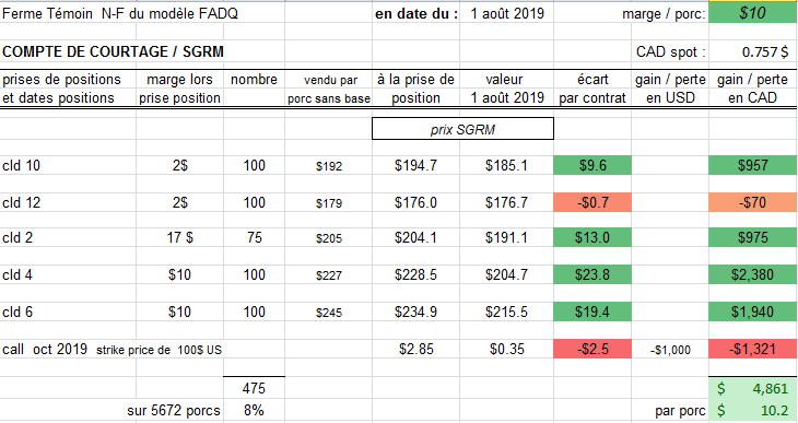 Jeudi 1er août, la baisse des hog continue depuis toute la semaine, la Ferme Témoin va renverser un peu de cld; mais pas tout, car dorénavant au SGRM on ne pourra prendre plus que 25% des porcs de l’année; tant que ces échéances ne sont pas derrière nous, les porcs déjà renversés comptent dans le calcul du nombre de porcs éligibles…. Par exemple pour la ferme Témoin vendant 5672 porcs par an, a droit à 1420 porcs au SGRM, qu’ils soient renversés ou non. Présentement elle détient 475 porcs, mais pour les échéances devant nous, la ferme a aussi dans son dossier aussi 300 porcs qui ont été renversés sur des échéances d’octobre 2019 à mars 2020, donc le SGRM calculerait 775 porcs ‘’utilisés’’. La ferme va renverser son cld 10 et son 2, pour garder des positions bien réparties dans le temps ( elle garde son cld 12, son 4 , son 6...).