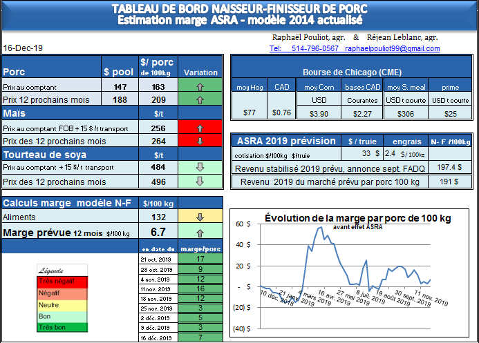 Lundi 16 décembre, la marge des 12 prochains mois du modèle N-F de la Financière est de + 6.70$ par porc de 100 kg , en hausse due à l’annonce de ce vendredi comme quoi la Chine et les États-Unis s’entendrait pour 50 Milliards de produits agricoles ( annoncé, une fois de plus, mais pas signé... ) . Les lean Hog étaient appelés avant l’ouverture à une hausse de 3 sous sur toutes les échéances, mais la journée s’est conclue un peu décevante, 1 sous seulement d’augmentation en moyenne. Il faut dire que ce n’est pas la première fois qu’on nous annonce une entente, et qu’un tweet vire tout de bord la semaine suivante. Il est prématuré de reprendre des positions pour ceux d’entre vous qui avaient liquidés leurs positions, laissons aller un peu.... extrait de l’article de Jim Long 9 décembre : ‘’ Les découpes actuelles de porc aux États-Unis à 82$ sont à la limite du miracle avec 2,8 millions de porcs abattus par semaine. C'est un véritable reflet de la demande, du pays et de l'exportation. Si l'abattage des porcs aux États-Unis tombe à 2,5 millions par semaine, où peuvent aller les découpes? 93 $ et plus ? ‘’. Ce qui ne signifie pas non plus qu’il faut attendre que les porcs montent à 280$ le 100 kg été 2020 pour en booker, les prix actuels de 238$ sont déjà très alléchants, et si ce n’était de la PPA , à +7$ de marges sur 1 an on fermerait déjà un bon pourcentage... mais nous ne sommes pas dans un contexte normal...
