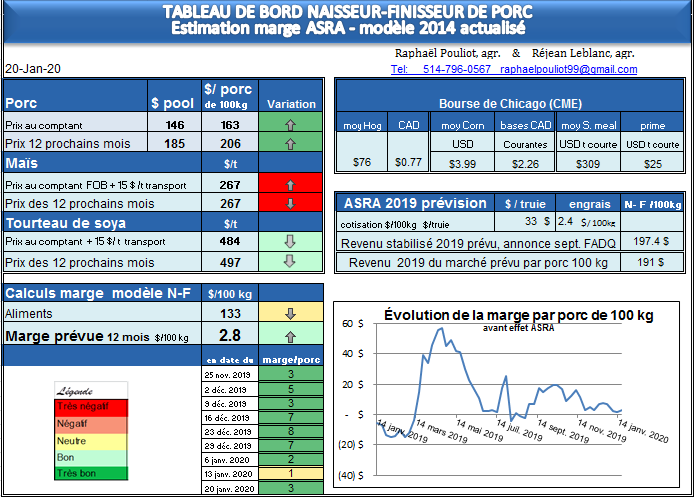La FADQ dans son annonce de janvier 2020 stabilise le porc à 197.20 $ du 100 kg pour 2019 , cependant les grains sont moins chers en 2019 qu’en 2020 ( selon ma compilation, le maïs était 235$ pris à la ferme en 2019, tandis que pour 2020 présentement on s’enligne pour 245$ à 250 $ pris à la ferme, mais avec du tourteau semblable entre les 2 années. ) , on s’enligne donc pour 2020 sur un prix stabilisé un peu au-dessus de 200$ par porc de 100 kg carcasse.